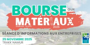 Participez à la séance d’information mardi 25 novembre pour la 2ᵉ édition de la Bourse aux matériaux qui se déroulera les 10 et 11 avril 2026 sur les parcs d’activité économique de Gembloux-Sauvenière et Ecolys.